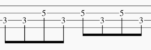 例えばこのような譜面を弾くときはずっと親指は3弦の上で弾くことができます。